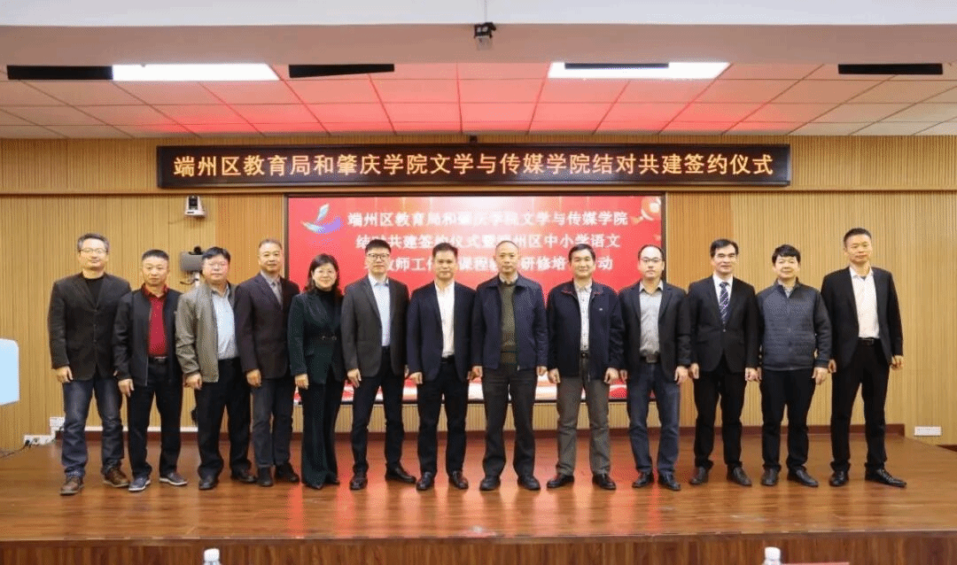 本网讯 12月17日,文学与传媒学院和端州区教育局举行结对共建签约仪式。双方将以“优势互补、资源共享、协同发展、互利共赢”为原则,在教师培养、教学改革、教育实习等方面开展深度合作,深入贯彻落实广东省“百县千镇万村高质量发展工程”及“百校联百县”行动部署,推动高校专业资源与区域教育实践深度融合,共同助力区域教育高质量发展。文学与传媒学院院长杨红军,区教育局局长王烁,以及双方单位相关负责人、教师发展中心代表、试点学校负责人、语文教研员、学科委成员、名师工作室主持人等参加。