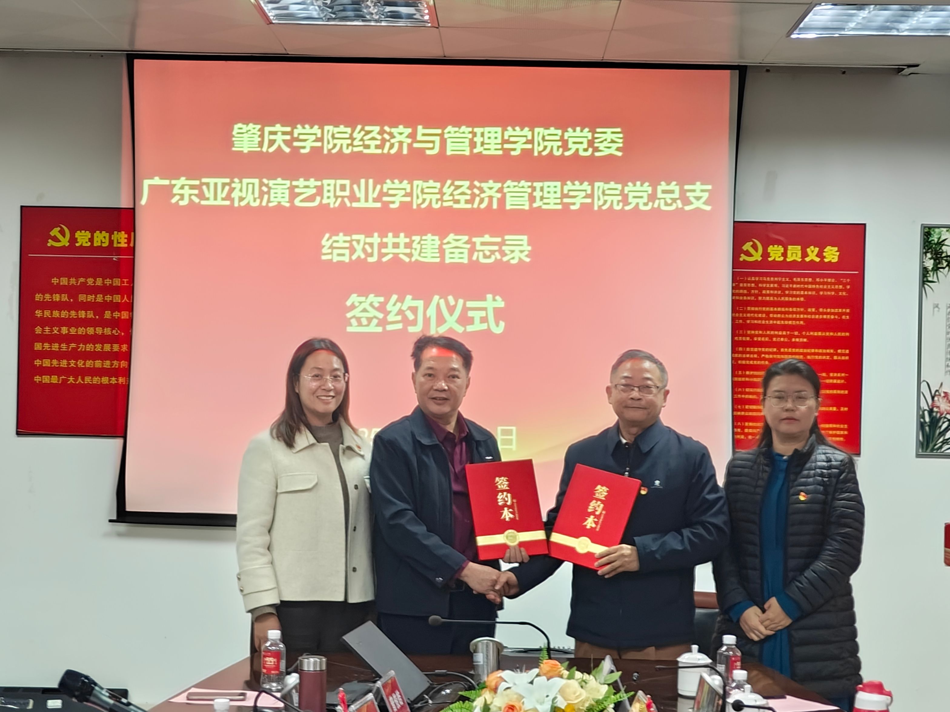 本网讯 12月26日,经济与管理学院党委与广东亚视演艺职业学院经济管理学院党总支在学院501会议室举行《两院党组织结对共建备忘录》签订仪式暨党建工作交流座谈会。广东亚视演艺职业学院经济管理学院党总支书记、院长陶永勇,党总支副书记、学工副院长朱进华,教工支部书记、教学副院长柳青等;经管学院政党领导班子成员出席活动。双方相关部门负责人及结对共建工作小组成员参加会议。