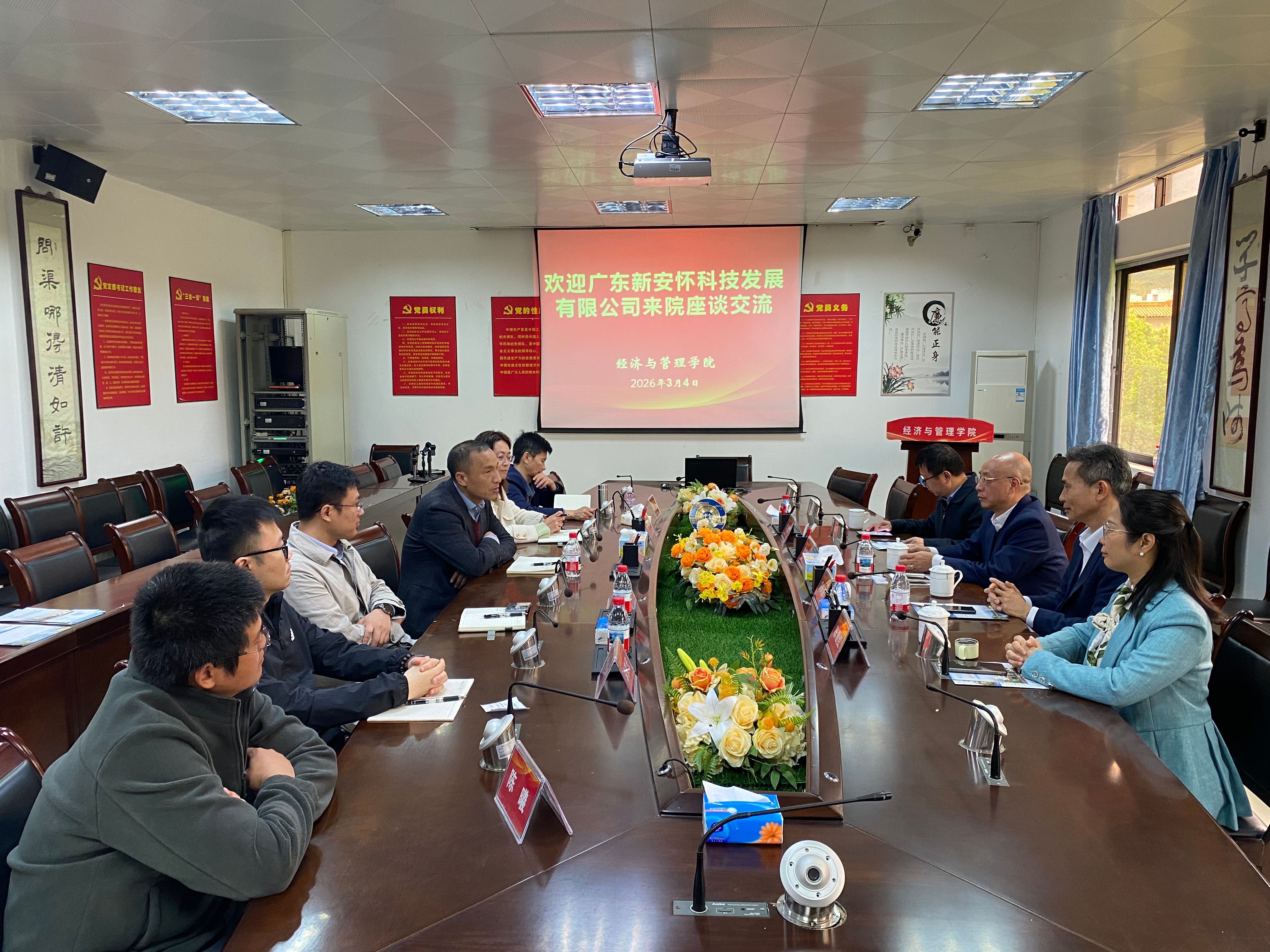 本网讯 3月4日,广东新安怀科技发展有限公司董事长、肇庆市进出口商会执行会长梁锡钧率公司高管团队及商会秘书长一行五人到经济与管理学院开展座谈交流,学院领导班子以及相关教师参加本次座谈。座谈会由学院院长李华军主持。