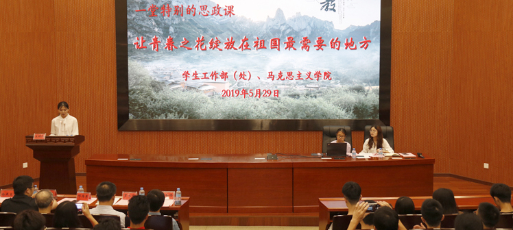 本网讯 5月29日,由学生工作处和马克思主义学院联合举办的“一堂特别的思政课——让青春之花绽放在祖国最需要的地方”在图书馆学术报告厅召开。学生工作部(处)副部长罗永全、马克思主义学院副院长曹和修,马克思主义学院教师代表、当天上思政课的部分班级学生及学生骨干代表共计400余人参加活动。该堂思政课由第二、第三批援藏支教的学生及带队教师主讲。