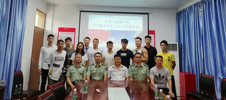 本网讯 为贯彻落实国家和省市关于做好2019年征兵准备工作的通知精神,鼓励高学历青年参军入伍,6月25日,体育与健康学院召开毕业生应征入伍专题座谈会。校武装部负责人应邀参加,学院党委书记李永佳主持,预征兵毕业生16人参加。