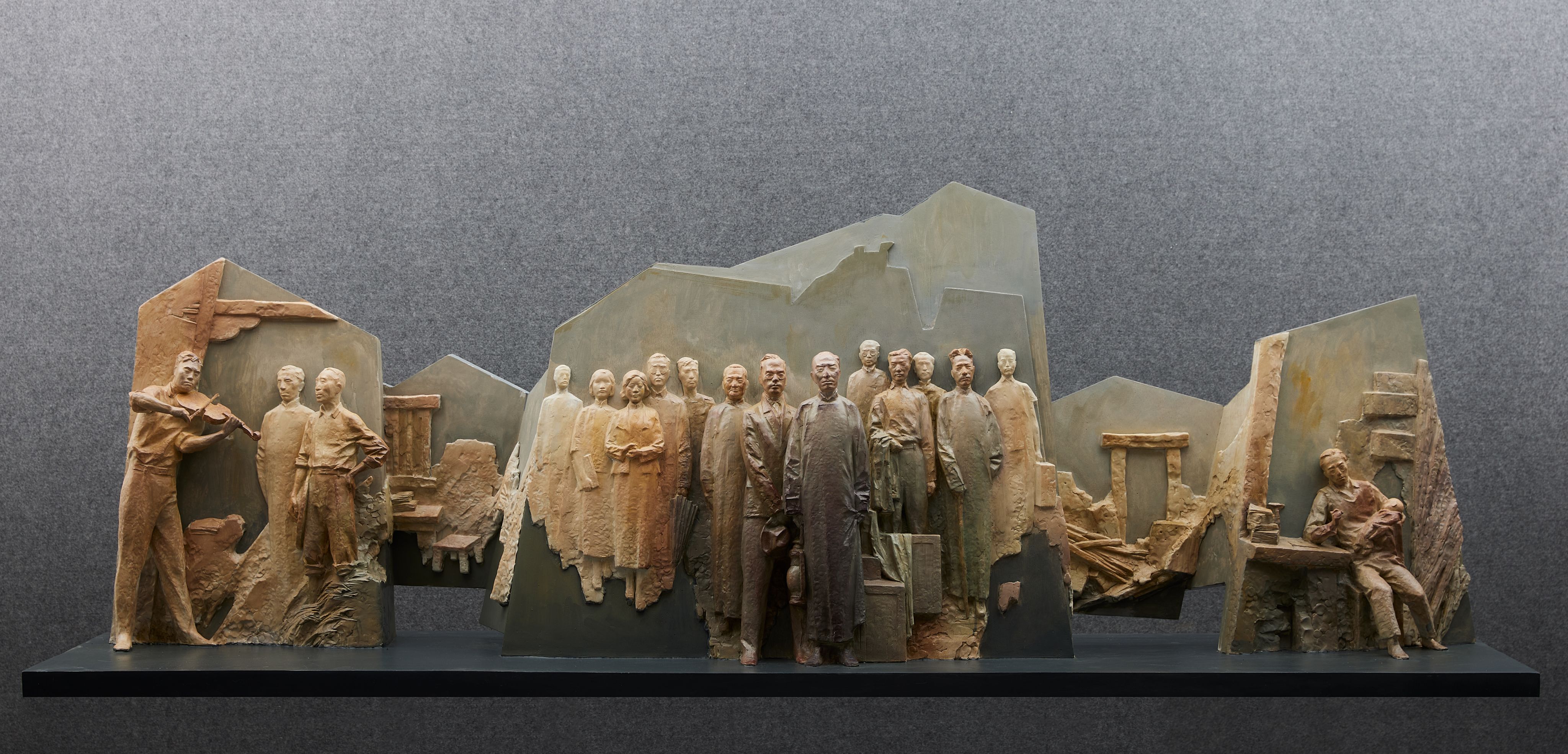 张超老师的雕塑创作《杏坛往事——坪石先生》,以抗战时期广州高校烽火办学,维系文脉为主题,表现广东教育先贤艰苦卓绝的奋斗历程与不屈信念。作品通过细腻的造型语言,生动还原了坪石办学时期师生坚守课堂、传道授业的历史场景。