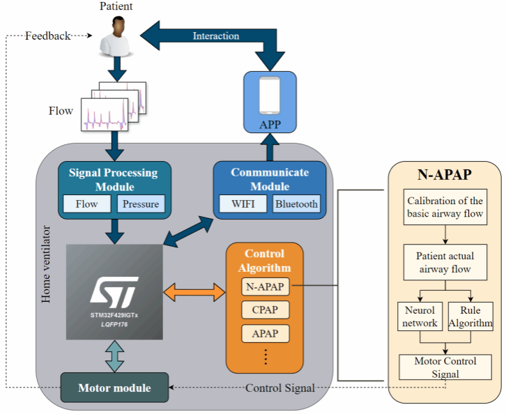 该论文聚焦现有家用呼吸机中APAP压力控制算法与患者呼吸事件不同步的问题,提出了一种基于神经网络的自动调节正压通气算法(N-APAP)。该算法通过对患者气流数据进行建模,引导压力调节过程更好地与呼吸事件保持同步,从而减轻人机不同步现象。研究进一步设计并比较了三种教师神经网络结构,并基于跨模态知识蒸馏策略获得轻量化学生模型。所提出的知识蒸馏方法融合了温度缩放、置信度加权和两阶段权重调度机制。与两款商用呼吸机的对比结果表明,该研究团队提出的N-APAP算法在人机同步控制方面表现更优,更不易出现人机对抗问题。