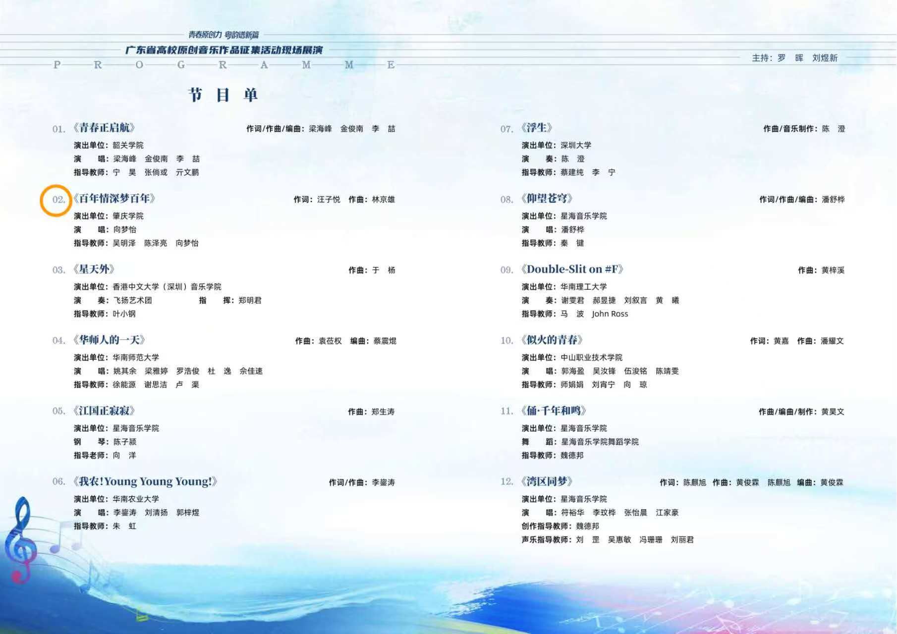值得一提的是,我校原创音乐作品《百年情深梦百年》受邀参与优秀作品现场展演。本次活动汇聚了全省高校音乐领域的顶尖力量,同台参演单位均为省内音乐标杆院校与专业团队。该作品由汪子悦作词、林京雄作曲,向梦怡老师担任演唱,在吴明泽、陈泽亮两位老师的专业指导下精心打磨完成。彰显了我院师生的艺术创作水准,体现了音乐专业人才培养的丰硕成果。