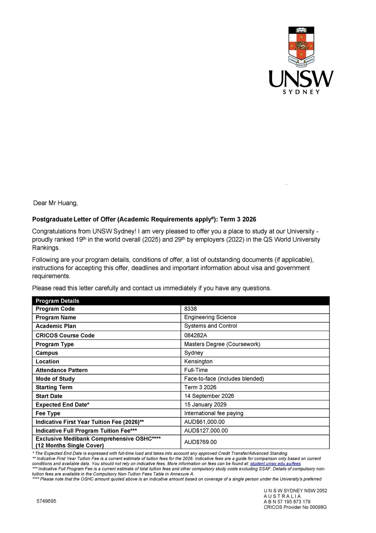 【黄育新同学及其新南威尔士大学研究生录取通知书】