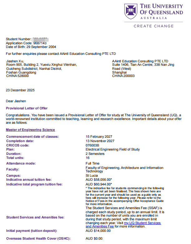 【徐嘉燊同学及其昆士兰大学研究生录取通知书】