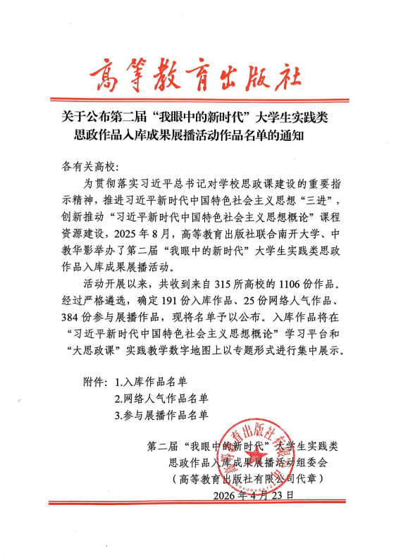 据悉,本次活动组委会共收到来自315所高校的1106份作品。经过严格遴选,确定191份入库作品、25份网络人气作品、384份参与展播作品,入库作品将在“习近平新时代中国特色社会主义思想概论”学习平台和“大思政课”实践教学数字地图上以专题形式进行集中展示。