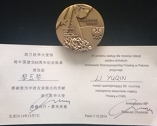 近几年来,黎院长一直致力于中波文化与友谊的交流,为促进中波文化交流、繁荣中波文化、加强中波友谊、密切中波合作作出了巨大的努力与奉献,正因为如此,波兰人民为感谢黎院长所作出的努力与奉献,授予其一枚象征国家荣誉的勋章,这是波兰人民对黎院长的充分信任与肯定。我们再一次祝贺黎玉琴院长荣获国家级荣誉勋章。